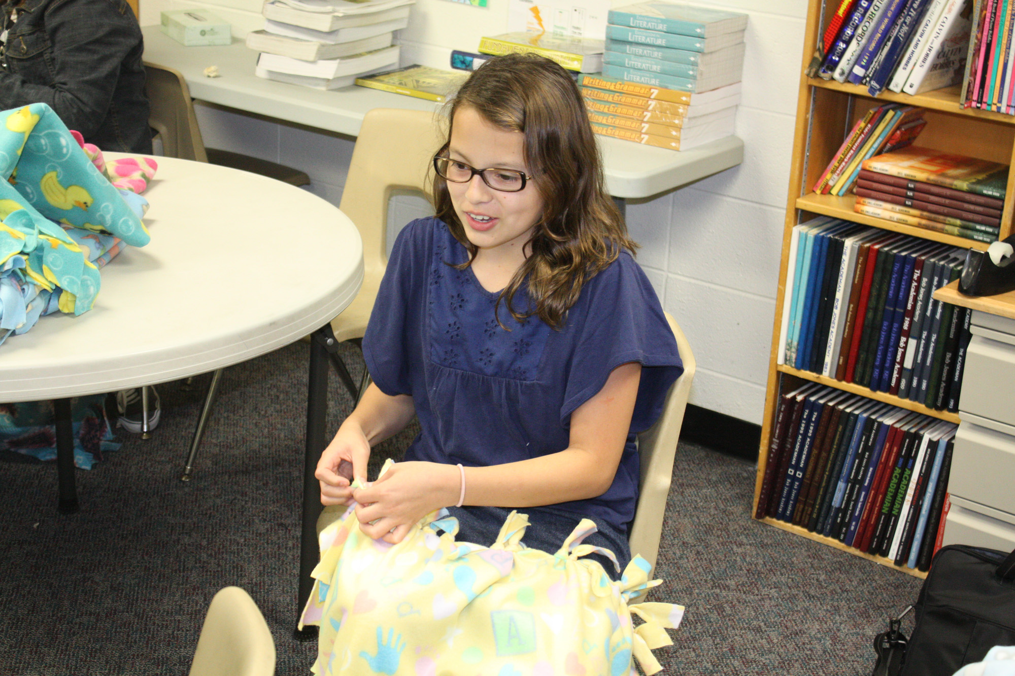 Seventh through twelfth grade students partnered with Molina Healthcare in a community service project to aid a children’s home in Anderson County. Mike Sowers, a former teacher at BJA and now the Community Engagement Coordinator for Molina Healthcare, brought to the students a project to make blankets for the children taken in by the home. The students cut and tied fringe to make blankets with precut pieces of fleece. While the high school students did the bulk of the cutting, the middle school students provided the much-needed assistance with the tying. In what resembled an old-fashioned quilting bee, nearly two dozen students gathered in the middle school resource room and worked their way through about 50 blankets. The students motivated themselves by choosing different patterns on the fleece—but primarily by reminding themselves of the children who would be using those blankets.