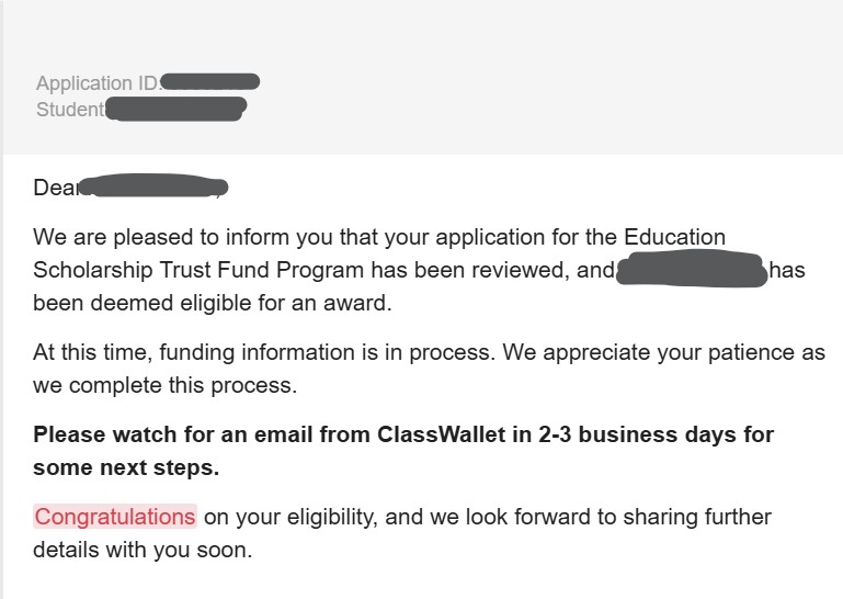 What does the eligibility confirmation look like? Here’s one sample (May 2025 email to parents). Also log in to ESTF FACTS account to see the status.
